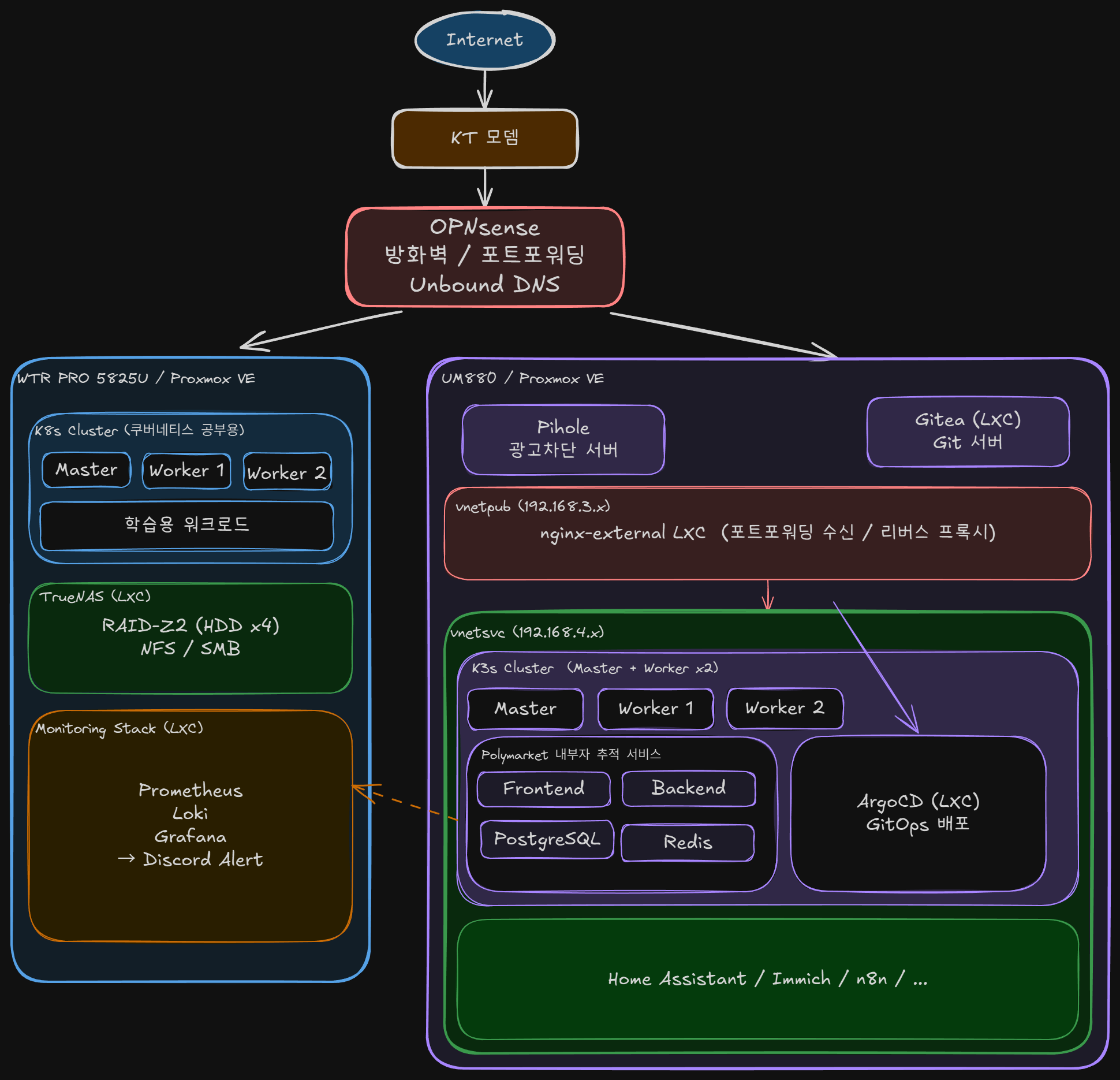 UM880 (Proxmox) K3s 클러스터(Master 1 + Worker 2)를 운영합니다. Gitea LXC를 Git 서버로 두고, ArgoCD를 통해 Polymarket 내부자 추적 서비스(Frontend / Backend / PostgreSQL / Redis)를 GitOps 방식으로 배포합니다. PiHole LXC로 DNS 기반 광고 차단을 운영합니다. 외부 접속 서비스는 vnetpub/vnetsvc 네트워크 분리 구조로 LXC에서 운영합니다.