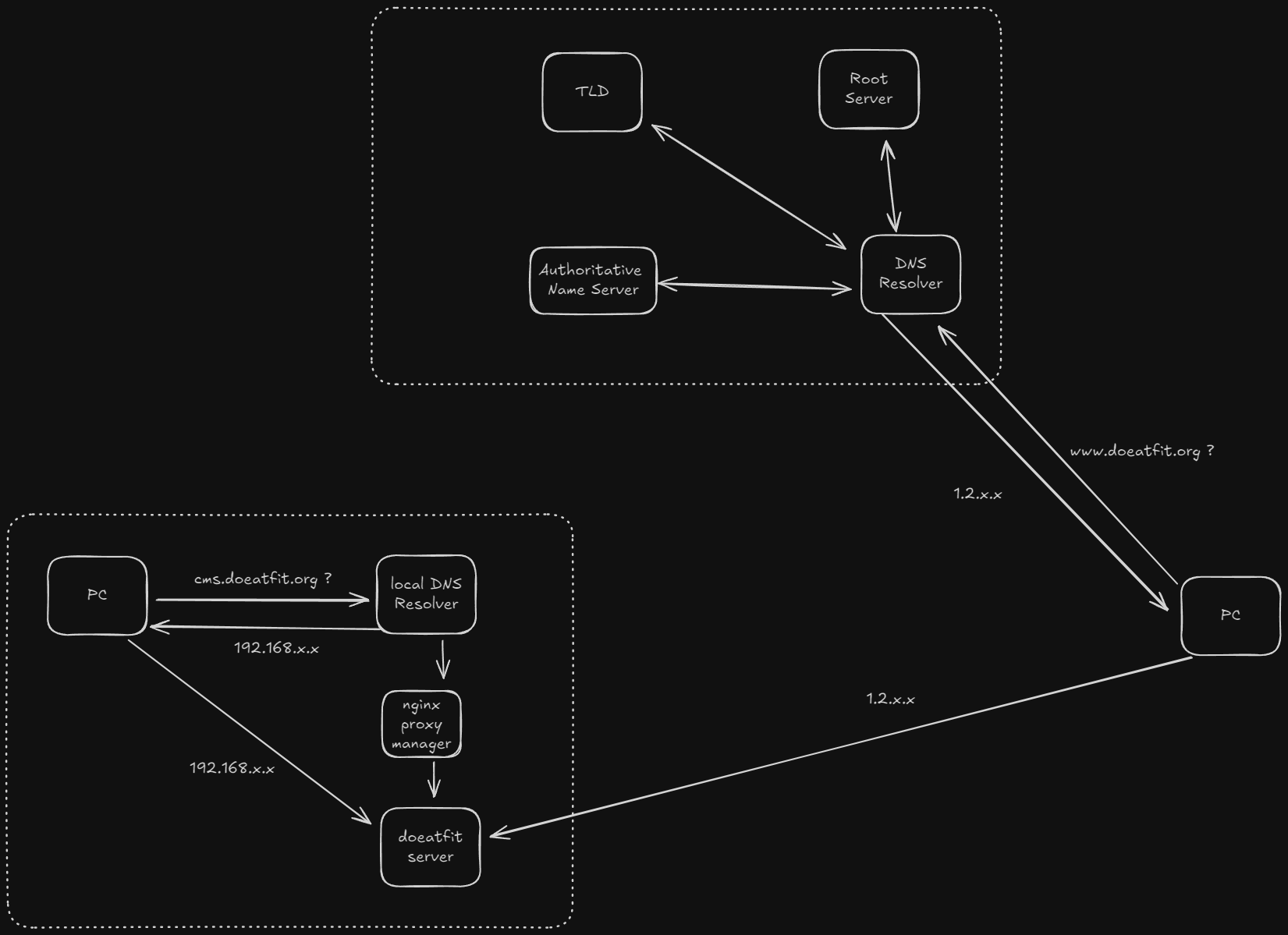 현재 프로젝트에서는 로컬 dns 서버로 unbound dns를 이용하고 있고 *.local.doeatfit.org 에 대한 DNS 조회는 Nginx Proxy Manager 가 설치된 서버로 재정의 하여 doeatfit 컨테이너를 실행중인 서버의 IP로 보내도록 합니다. ( Nginx Proxy Manager WebUI 에서 cms.local.doeatfit.org 설정이 됐다는 가정 하에 )
