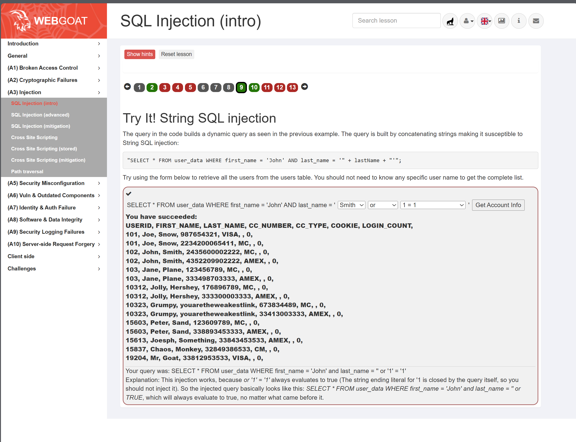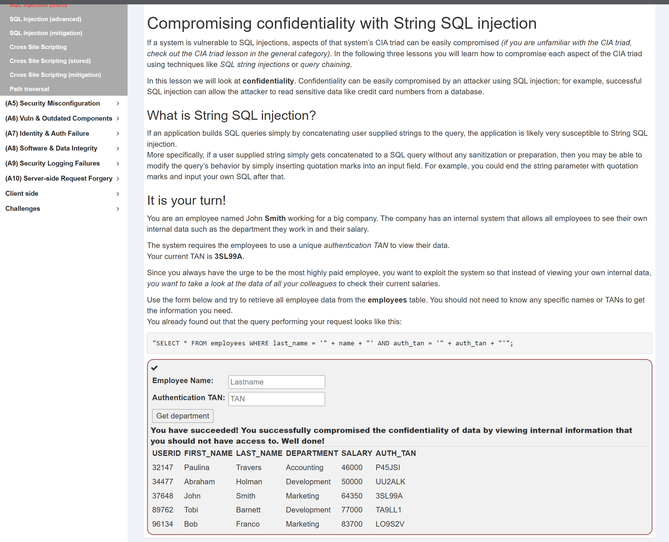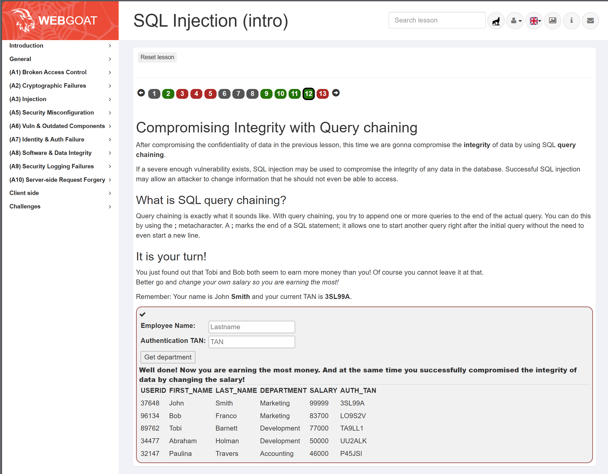 • 정답: Employee Name: [아무 문자], Authentication TAN: '; update employees set salary = 99999 where last_name = 'Smith';--