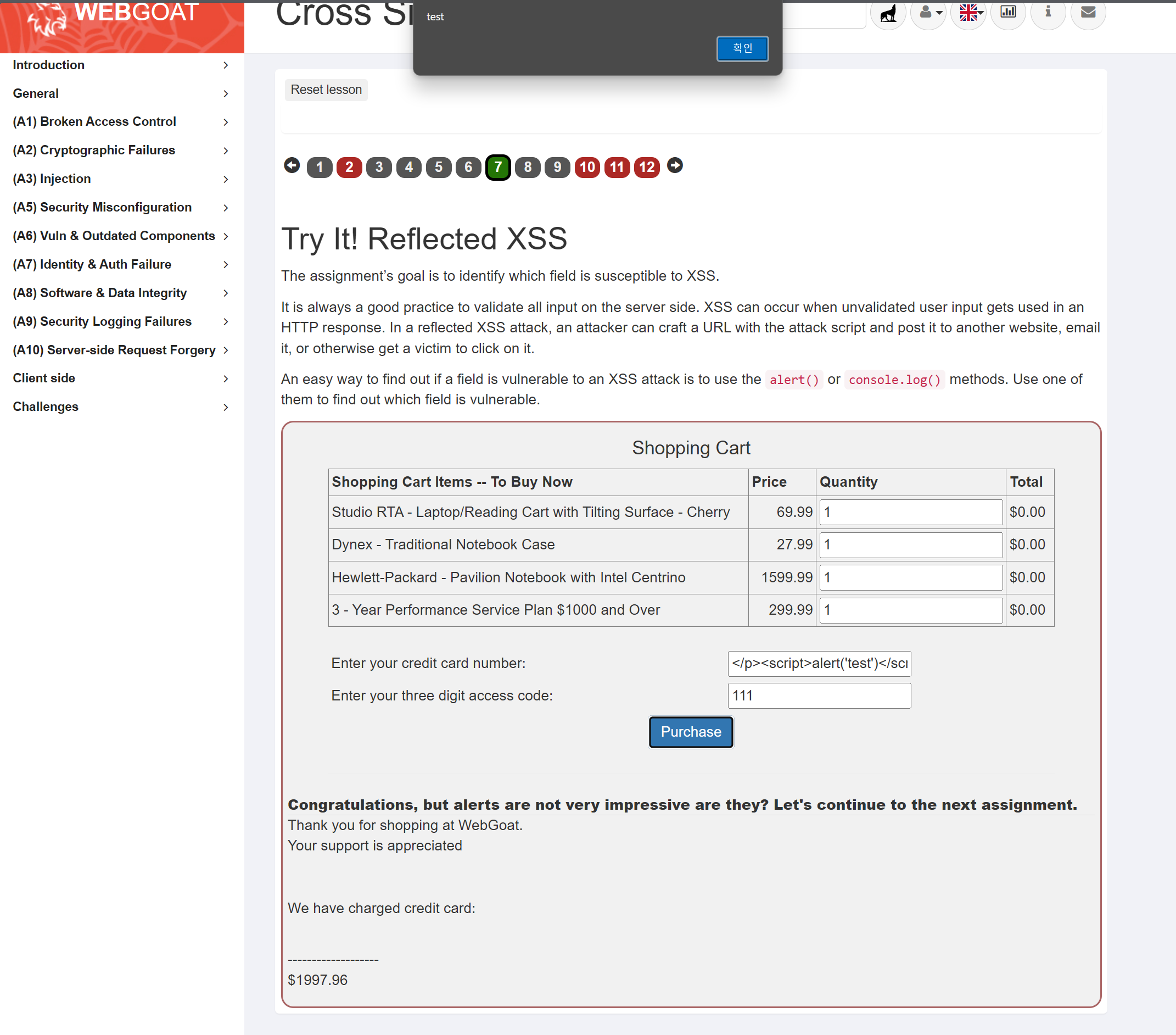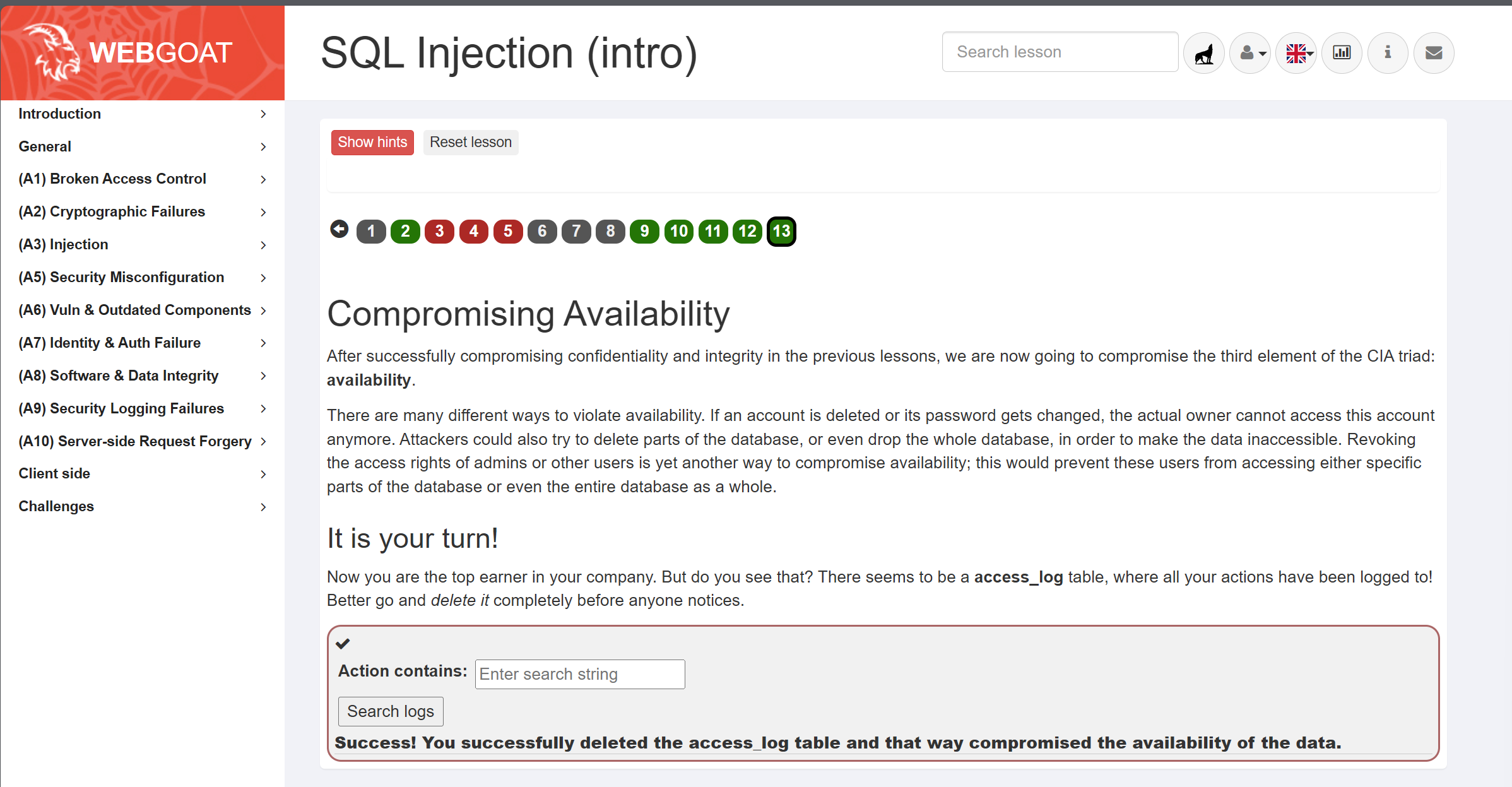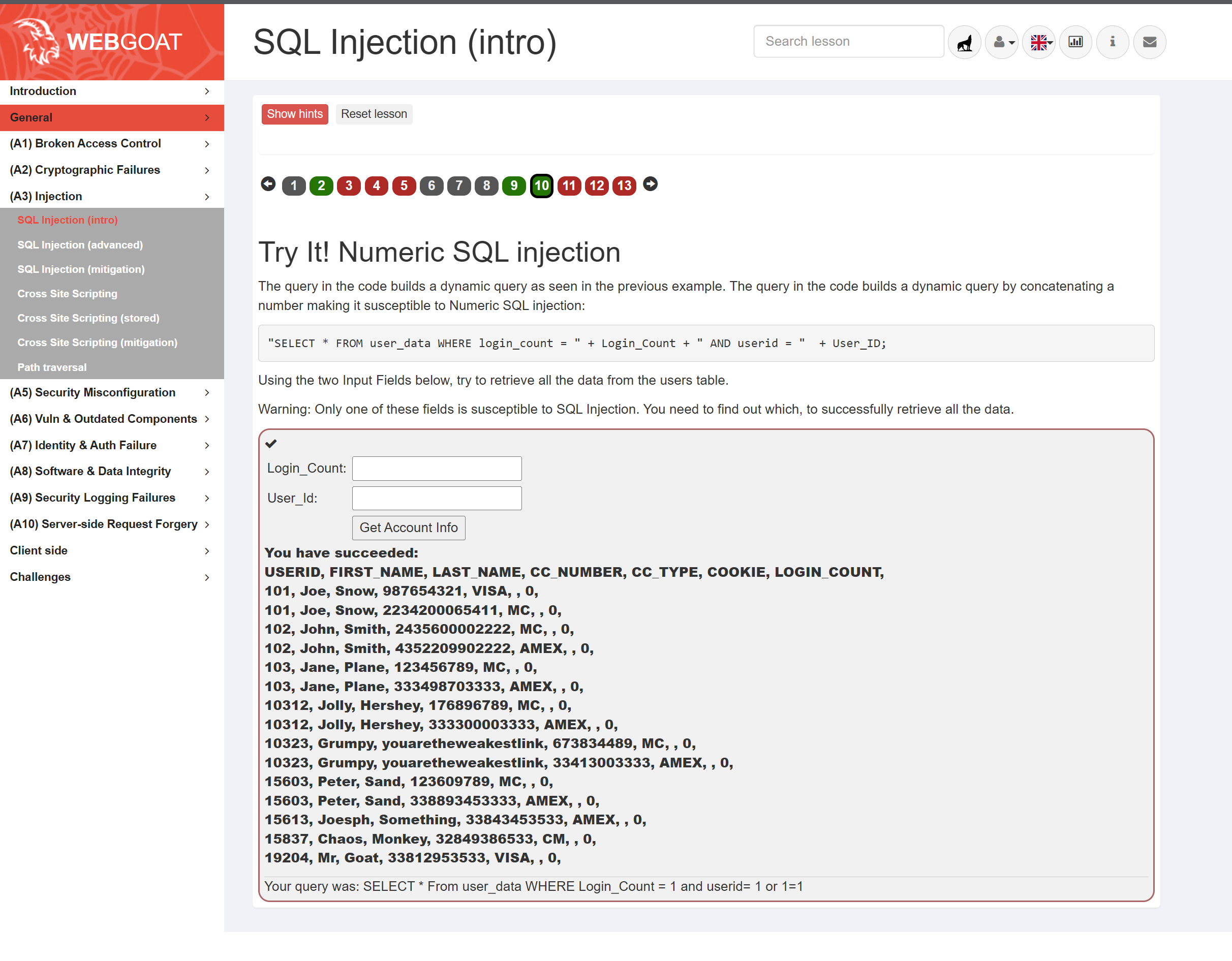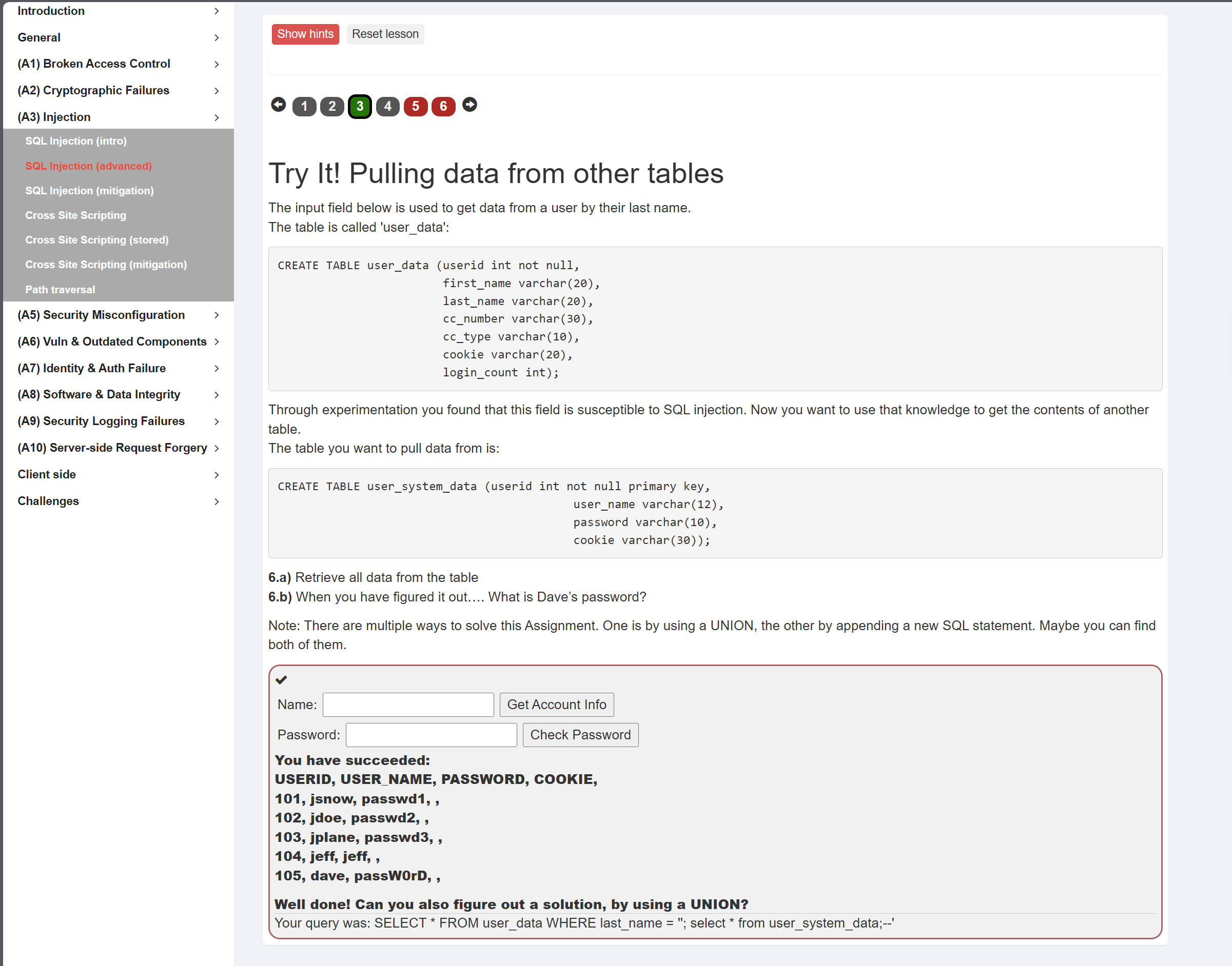 • 정답: Employee Name: [아무 문자], Authentication TAN: '; update employees set salary = 99999 where last_name = 'Smith';--