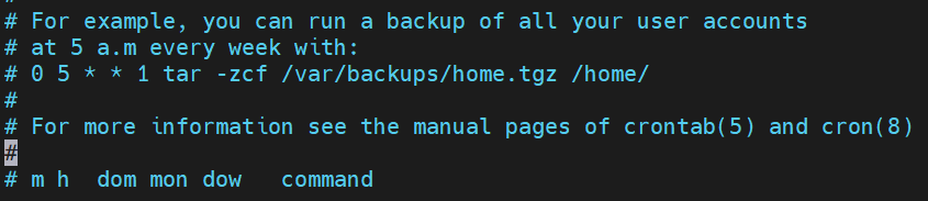 분(0-59) 시(0-23) 일(1-31) 월(1-12) 요일(0-7) -e: 작업 편집-l: 작업 목록 확인-r: 모든 작업 삭제