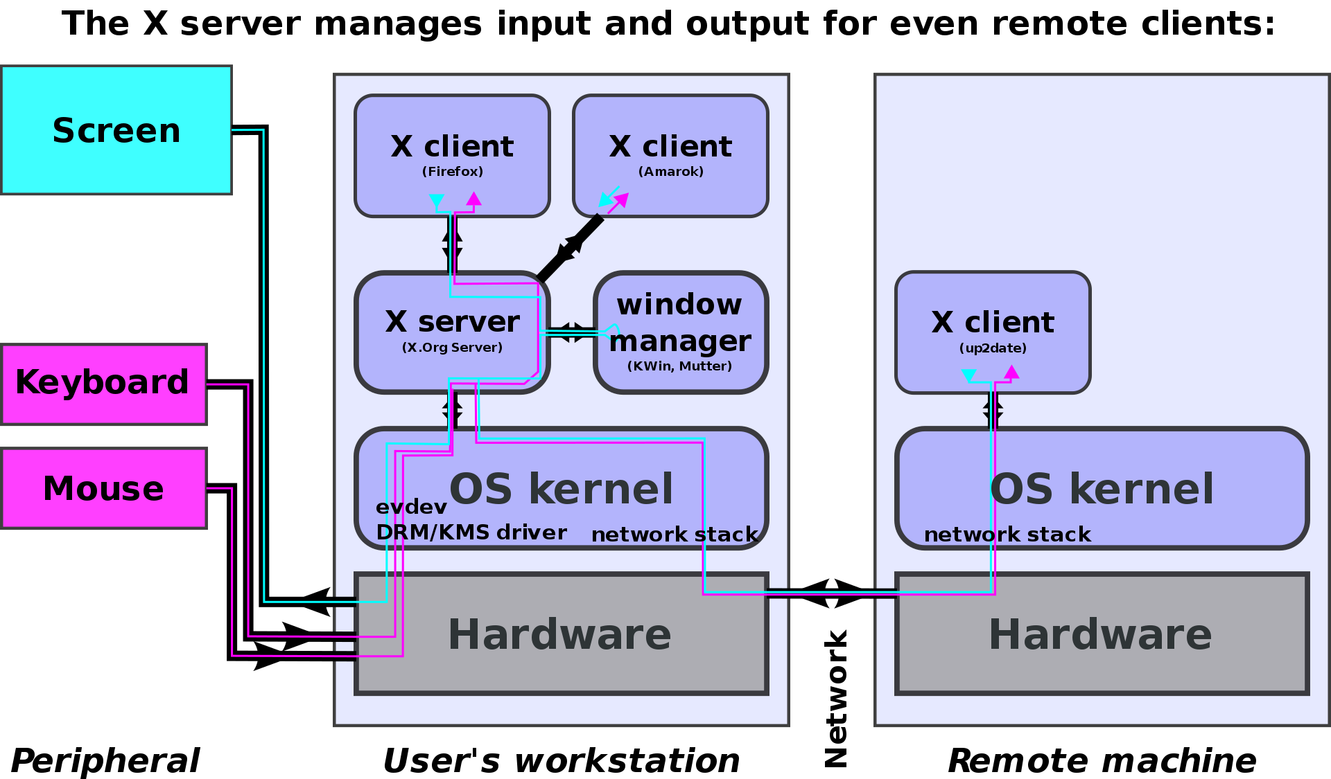 - X 서버 (X Server): 사용자의 키보드, 마우스, 모니터 등 입출력 장치를 직접 제어하는 프로그램입니다. 클라이언트가 “그려달라”고 요청한 그래픽을 화면에 표시하는 역할을 합니다. 사용자 앞에 있는 컴퓨터에서 실행됩니다.